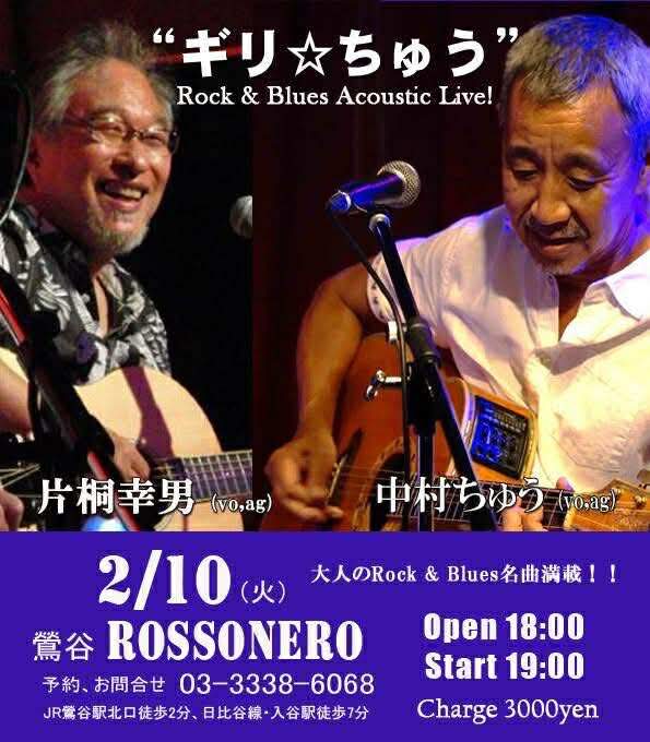 2月102026 鶯谷ロッソネロ「ぎりちゅう」 VOCAL ≪メンバー≫ 片桐幸男(Ag,Vo) 中村ちゅう(Ag,Vo) ≪詳細≫ ◆Date 2026/02/10(Tue) ◆Open 18:00 ◆Gig 19:00 ◆Close ◆Music Charge ¥3000 ◆Table Charge One Order/One Stage Player: 中村ちゅう(4), 片桐幸男(26) ≪会場≫ Cafe&Bar ロッソネロ Address 東京都台東区根岸1-5-13 Phone 03-5808-9984 Mail rossonero0325@gmail.com WEB Site https://rossonero-bar.com/ Player: 中村ちゅう(4), 片桐幸男(26)