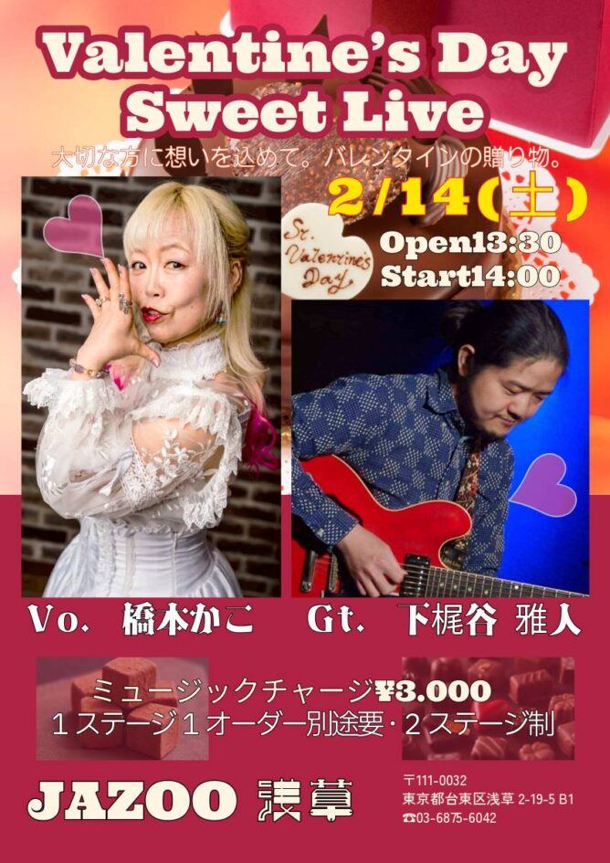 2月142026 Jazzoo浅草 初出演❤️ 橋本かこ&下梶谷雅人 VOCAL ライブ・バンドのキャッチフレーズ ライブ・バンドの紹介 Player: かこ(1), 下梶谷雅人(3), 橋本かこ(6) ≪メンバー≫ 橋本かこ(Vo) 下梶谷雅人(Gt) ≪詳細≫ ◆Date 2026/02/14(Sat) ◆Open 13:30 ◆Gig 14:30(入替無) ◆Music Charge 3000(税込) 1 Stage 1 Order Player: かこ(1), 下梶谷雅人(3), 橋本かこ(6) ≪会場≫ Jazoo浅草 Address 東京都台東区浅草2-19-5 B1 Phone 03-6875-6042 Mail info@jazoo-asakusa.jp WEB Site https://jazoo-asakusa.jp/ Player: かこ(1), 下梶谷雅人(3), 橋本かこ(6)